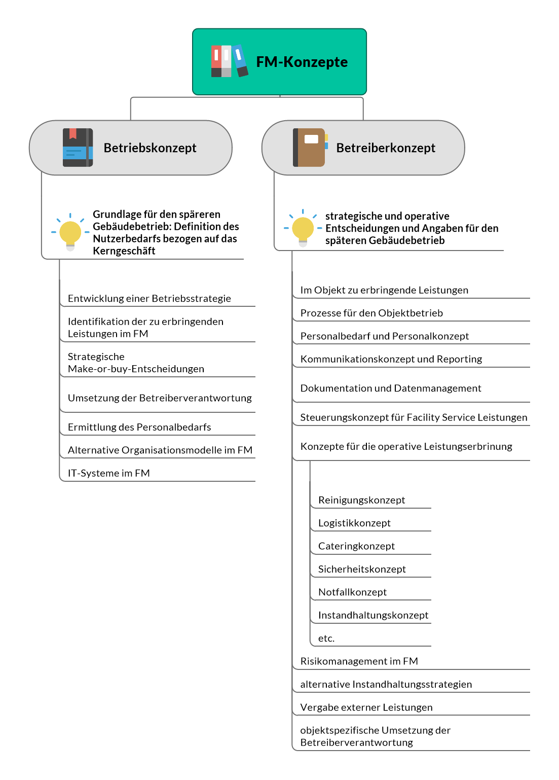 Neben der Optimierung des Gebäudes ist die Planung des künftigen Gebäudebetriebs eines der Kernaufgaben im planungs- und baubegleitendem Facility Management. In den Phasen der Gebäudeplanung steht die Entwicklung eines Betriebskonzepts im Vordergrund. Das Betriebskonzept definiert den Nutzerbedarf bezogen auf das Kerngeschäft und bildet somit die Grundlage für den späteren Gebäudebetrieb. Im weiteren planungsverlauf erfolgt auf Basis des Betriebskonzepts die Entwicklung eines objektspezifischen Betreiberkonzepts. Das Betreiberkonzept enthält strategische und operative Entscheidungen und Angaben für den späteren Gebäudebetrieb. Die unten stehende Grafik veranschaulicht die Inhalte der oben genannten FM-Konzepte: